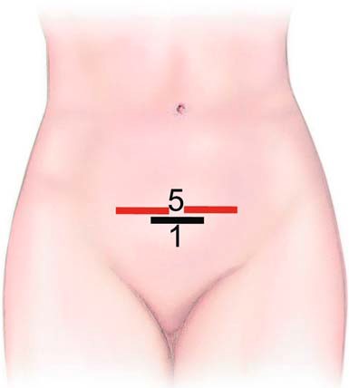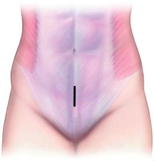 Incisões mais comumente usadas para o acesso anterior da coluna lombar, incisão infraumbilical, o tamanho da incisão depende do paciente e de quantos níveis da coluna serão operados.