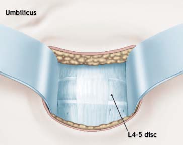 É, para tanto, realizada uma pequena incisão pelo abdome, que pode ser infraumbilical, ou seja, abaixo do umbigo ou um pouco mais lateral e, quando possível, até uma incisão parecida como uma cesariana. Dessa forma, o neurocirurgião terá uma visualização melhor do disco doente (degenerado), com isso, permitindo maior retirada do disco e a colocação de uma prótese também maior, o que é muito benéfico, pois essa prótese é o suporte entre duas vértebras; portanto, quanto maior o Cage (nome da prótese) maior será a descompressão do nervo e maior a chance de uma fusão óssea.