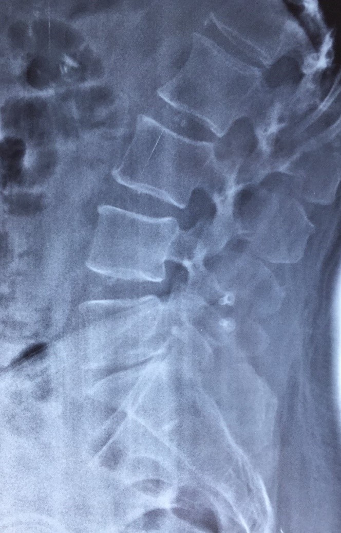 Radiografia da coluna lombar antes da cirurgia evidenciando importante desgaste do último disco vertebral L5/S1.