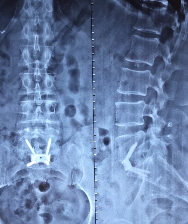 Radiografia da coluna lombar pós-operatória evidenciando o bom ganho de altura do espaço em L5S1.