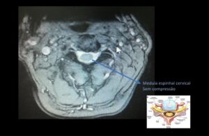 MIELOPATIA ESPONDILÓTICA CERVICAL O estreitamento da cana vertebral cervical ocorre devido à presença de abaulamentos ou hérnias discais, juntamente com osteófitos, formando o complexo disco